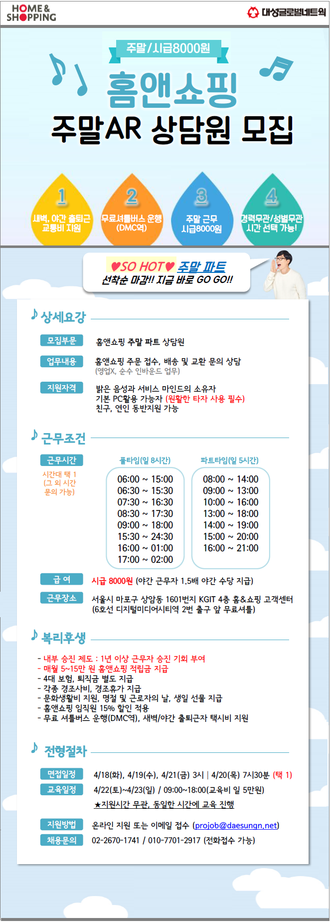 | 제목 | 홈앤쇼핑 주말AR 모집 | ||||