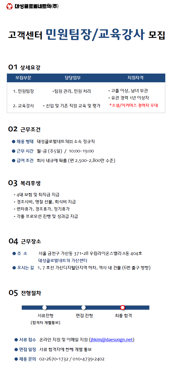 | 제목 | 고객센터 민원팀장, 교육강사 채용 | ||||