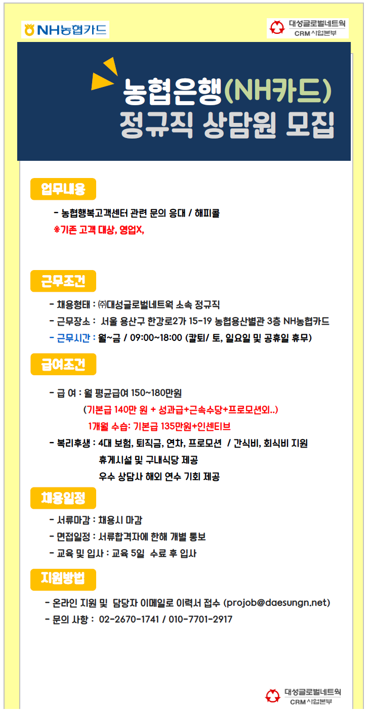 | 제목 | 농협카드 해피콜 상담원 모집 | ||||