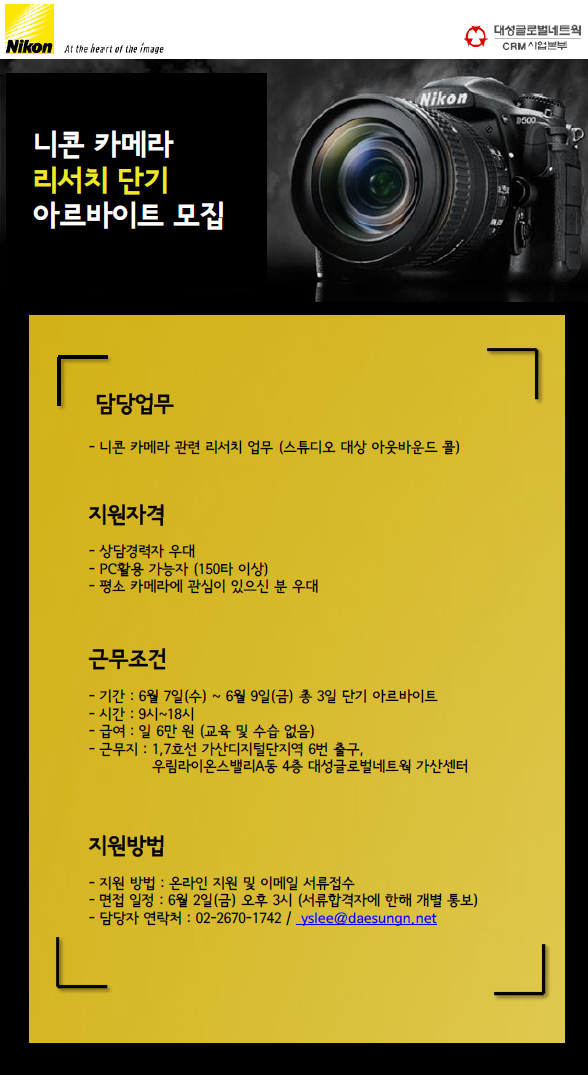 | 제목 | [니콘]단기알바 채용건/가산 | ||||