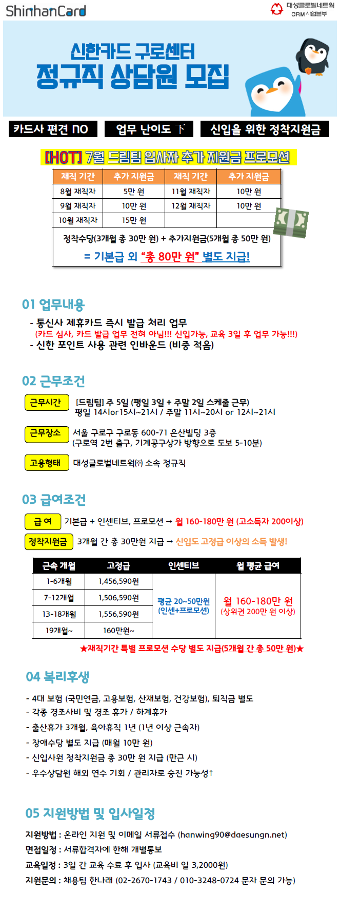 | 제목 | 구로 신한카드 드림팀 상담원 모집 | ||||