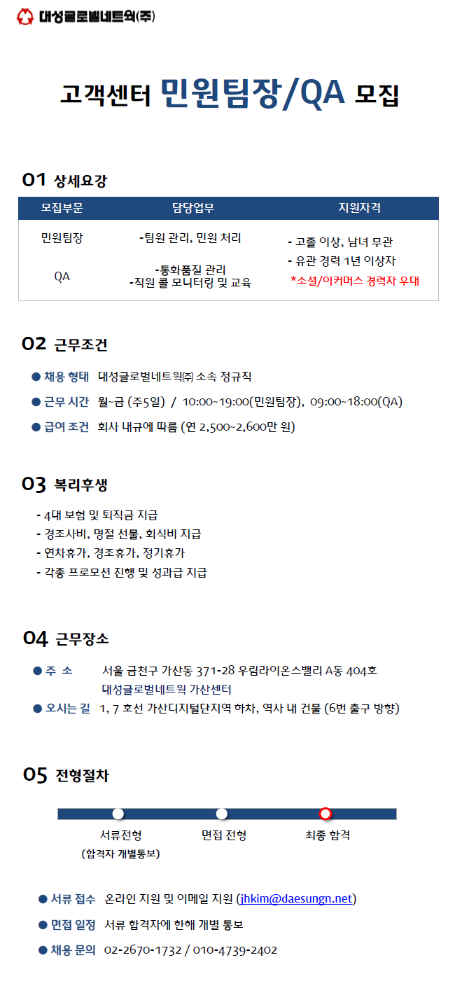 | 모집분야 | 관리자 | 업직종 | QAA | 마감일 | 2017-06-30 |